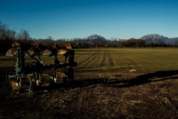 Figura 2 – Una foto semplice ma completa: l’elemento in primo piano si relaziona col campo e con lo sfondo (3 piani) ma racconta anche uno spaccato di vita rurale (aratro e solchi del campo) al cospetto di Grigne e Resegone. La luce del tramonto enfatizza. ph S Michelin