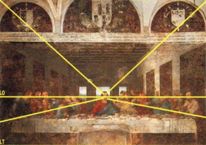 Le linee gialle indicano la LINEA DI ORIZZONTE, ovvero la linea che indica l’altezza degli occhi dell’osservatore (LO) e alcune linee di forza dei dipinti che convergono nel punto di fuga.