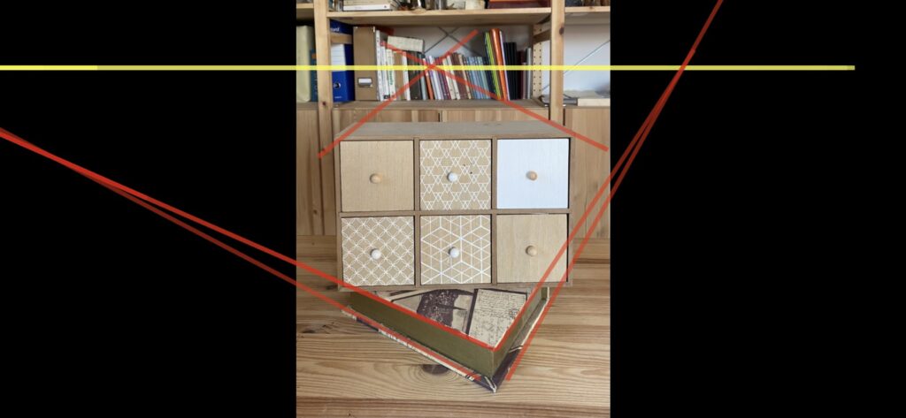 In modo molto intuitivo, successivamente, posiziono il punto di fuga centrale e congiungo ad esso le linee superiori della cassettiera per crearne la profondità, mentre per quanto riguarda la scatola di base, mi basta osservare dove essa incrocia con l’oggetto sovrastante per ricostruirne la prospettiva senza alcuna difficoltà.