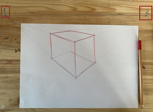 1. Fisso i due punti di fuga e traccio la linea dello spigolo in primo piano