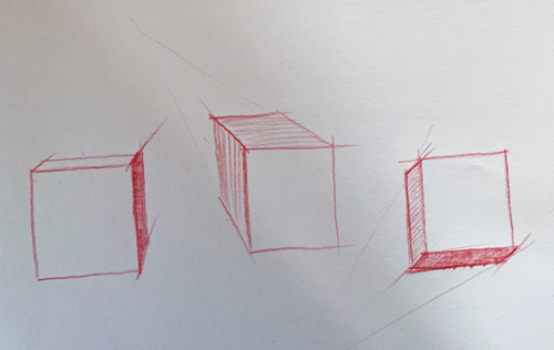 Posso esercitarmi cambiando infinite volte la posizione del punto di fuga. Provate a spostare la scatola davanti a voi a destra o a sinistra, più in alto e più in basso(senza ruotarla) e vedrete come cambia radicalmente il vostro punto di vista e di conseguenza il disegno.