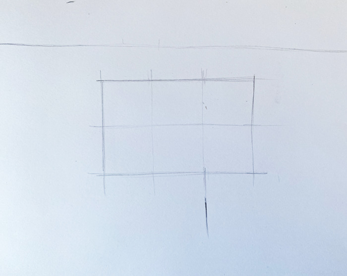 Parto quindi disegnando la mia linea di orizzonte molto in alto nel foglio. Poi disegno un rettangolo per la cassettiera di proporzioni 2(altezza) per 3(larghezza) sfruttando la modularita’ dei cassettoni quadrati e lo spigolo centrale della scatola sottostante che coincide con una delle verticali della cassettiera.