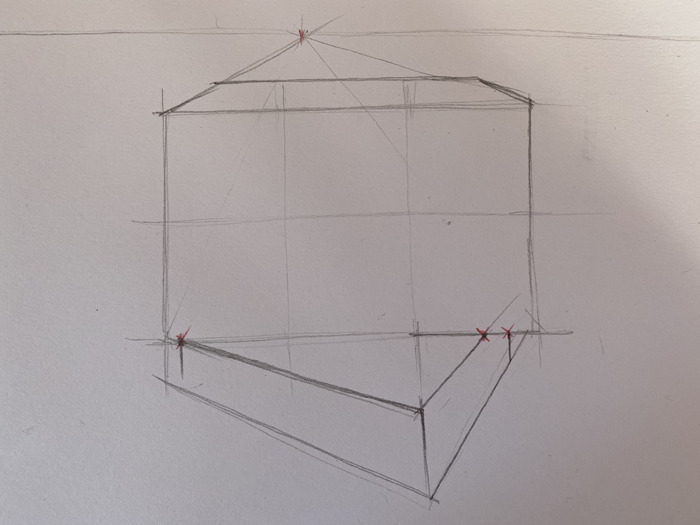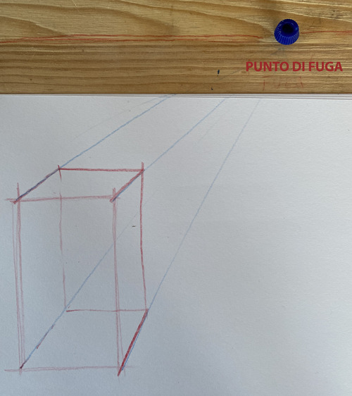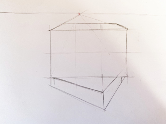 3. Stabilisco la posizione del punto di fuga (che determinerà quali altri lati dell’oggetto vedo dalla mia posizione è come saranno orientati) e vi congiungo tutti i 4 angoli del lato che mi appare frontale.