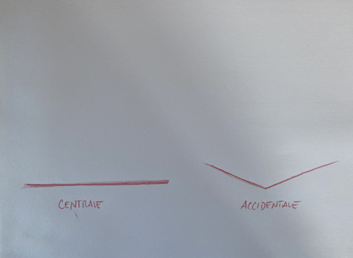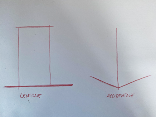 Userai la CENTRALE quando il tuo punto di vista sarà frontale ad un lato dell’oggetto che ritrai, userai la ACCIDENTALE (O LATERALE) quando sarai frontale ad un angolo, cioè accidentale ai lati dell’oggetto.