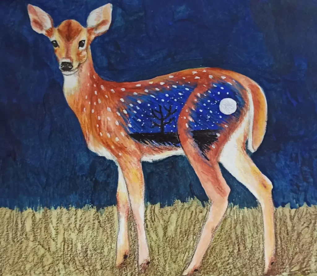 L’idea che io ho selezionato per questa esercitazione è quella di un cerbiatto le cui macchie bianche diventano stelle. Nel suo manto disegnerò anche una luna e aggiungerò dei semplici elementi che faranno pensare a un paesaggio. Il manto passerà da fulvo a blu per riprendere l’idea del cielo.