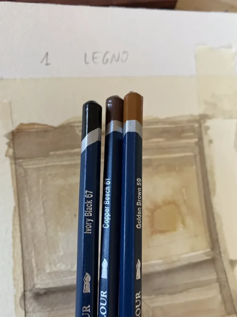 5 – Quando anche la seconda velatura sarà asciutta possiamo prendere le matite colorate. Ho proposto di usarne di due tipi: acquarellabili e non. La ragione è molto semplice; andremo poi a fondere la matita acquarellabile nella base ad acquarello mentre useremo quelle non acquarellabili per tutti i segni che vogliamo restituì netti e non sbavati come ad esempio bordi, ombre sottili, profili, fori, granulati ecc.