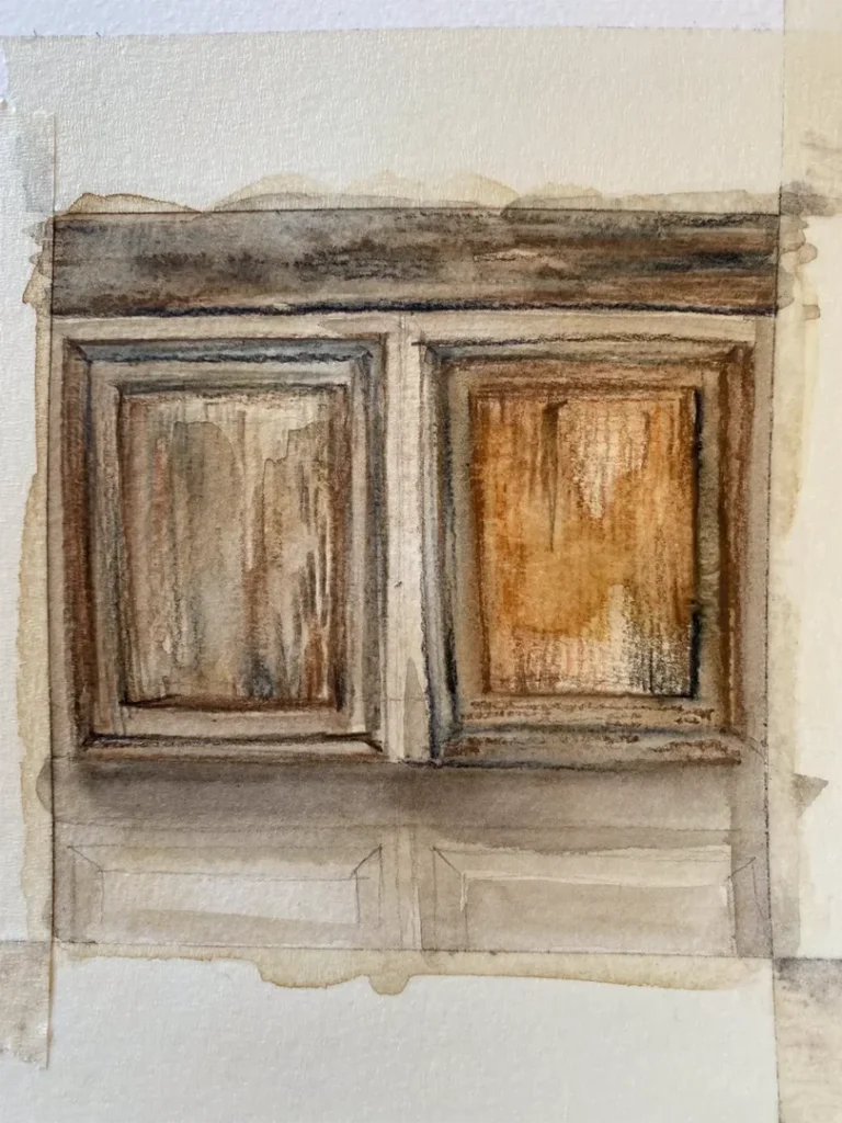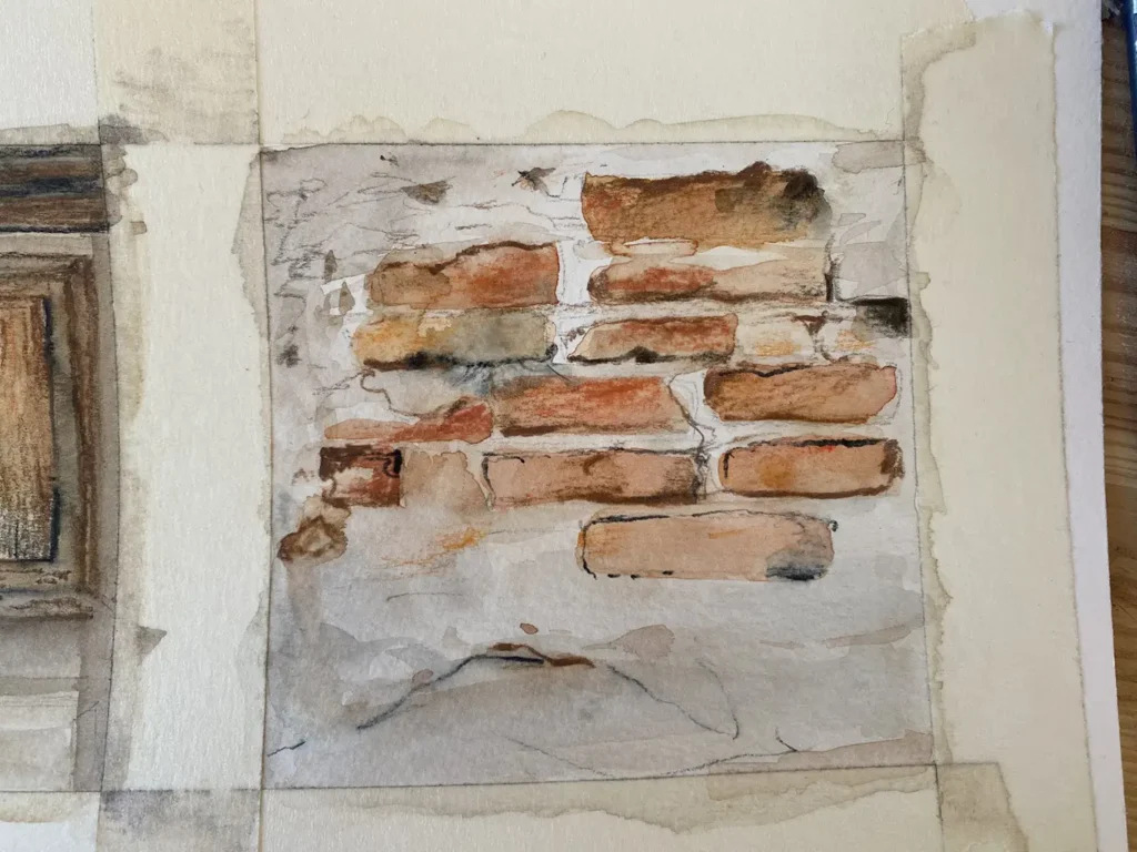 4 – Una volta asciutto ho ritenuto opportuno procedere con un’altra velatura ad acquerello che già definisse alcuni volumi e dettagli, come i cassettoni di legno o i mattoni in cotto. Non esagerate comunque con la saturazione del colore perché procederemo più tardi con i dettagli a matite colorate.