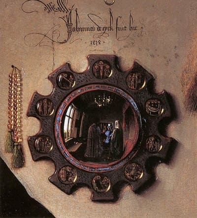 Il dettaglio che ha fatto tanto successo, all’epoca e tutt’oggi, è lo specchio in cui sono riflessi il pittore stesso e un altro personaggio in qualità di testimoni dell’evento.