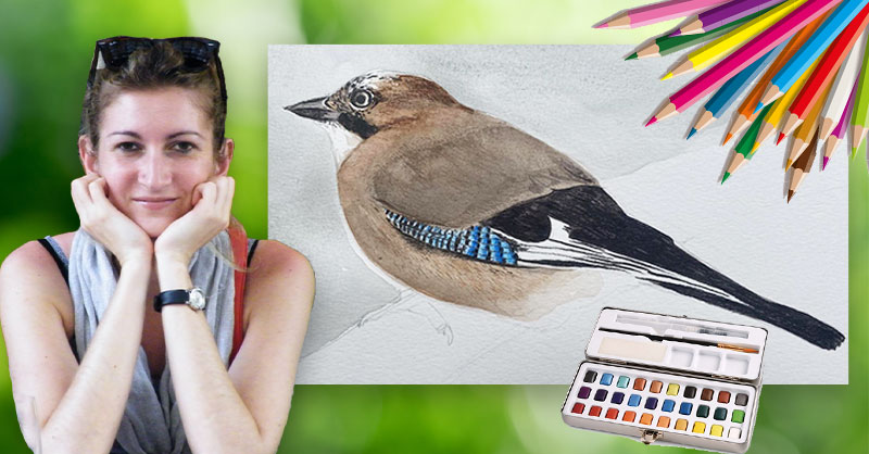 Iniziamo con l’utilizzo dell’acquerello per le parti colorate: dobbiamo in primis ricordarci di preservare le zone bianche lasciando il fondo asciutto e procedere bagnando le aree che vogliamo colorare, ovvero il corpo della ghiandaia color ocra scura o terra di Siena naturale chiara e terra d’ombra dall’aspetto grigiastro.